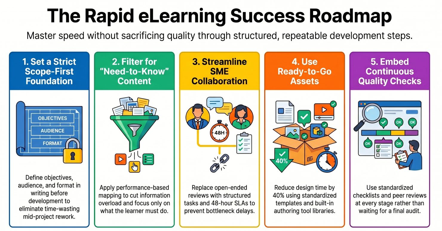 Rapid eLearning development challenges don’t disappear by wishing for more time or a bigger team. They’re managed through deliberate process design, the right tool stack, structured collaboration with SMEs and stakeholders, and a clear-eyed understanding of what quality means at each phase of development.